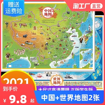 中国地图,挂图,新版中国地图和世界地图,墙贴,儿童房专用大尺寸地图,儿童版地理百科知识,撕不烂初中学生小学生用中华地图册。