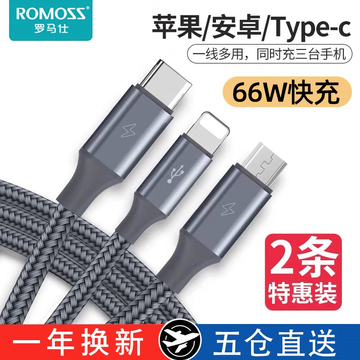 罗马仕三合一数据线,值得信赖,全新升级,安全提速,苹果安卓华为通用,三部设备,共享充电,车载必备。